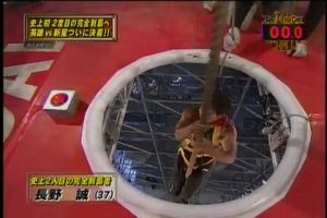 Despite managing to advance to the Final Stage again and successfully climbing the tower, he missed hitting the buzzer by 0.11 seconds. Even as he stood at the top of the metal mountain, Nagano vowed to not look down onto the course, only doing so should he actually win. In the tournaments after, he would advance again to the Final Stage in Sasuke 13 (matching Ōmori’s record), but failed once more (this time by about 10 cm). In Sasuke 14, he failed the new Jumping Bars, an obstacle he expected himself to clear. In Sasuke 15, he shocked many by failing the modified Metal Spin in the Second Stage. In Sasuke 16, he dubiously failed the Devil Balanço/Devil’s Swing when he grabbed the pipe of the Pipe Slider, but lost his grip and the pipe slid down the track, leaving him with an impossible task of swinging to the pipe. During this span, he wore the #100 as everyone expected him to make up for his Sasuke 12 near-miss.