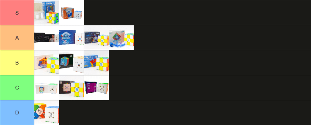 To summarize, the SwiftBlock is really the only cube I’d say people should say pass if you aren’t interested, although I’d even put the RS3M 2020 as dangerously close as well. The YuLong v2 I believe isn’t sold anymore as there is now a v3, and I believe that cube performs similarly. The MeiLong v2 is a great entry-level speedcube, and that cube’s release likely means that it will be difficult to get your hands on a MeiLong v1. The RS3M v5 with the dual adjustment system is a step up from the v2, so if you really want to hit the ground running and skip the entry-level stuff, go with that cube. The Super RS3M v1 is a great cube, although if you get one with a ball core, switch out the default core with the spare one immediately. When I look at the cubes in A tier, they are all excellent, although I would use the others before the YS3M, and the Ferrocore and v11 are interchangeable for the best in that tier. S-tier is reserved for my personal favorites, with the Ball Core RS3M v5 being my end-all-be-all cube.